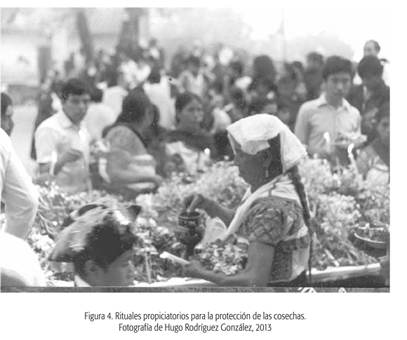 La obtención de las cosechas se encuentra determinada tanto por el esfuerzo humano como por la benevolencia de las fuerzas de la naturaleza, y el ciclo agrícola se encuentra enmarcado por rituales que buscan propiciar a las deidades, llamadas genéricamente "aires" o yeyekatlames, para proteger las siembras y obtener de la naturaleza la medida justa de lluvia, viento y sol que permita cosechar los productos de la tierra (ver la figura 4).