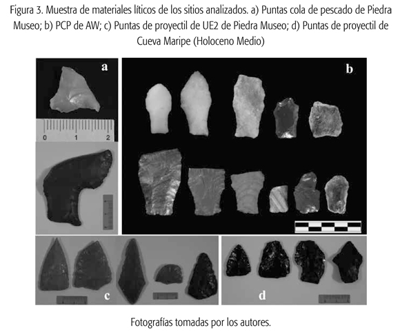El conjunto lítico está compuesto por herramientas unifaciales, así como por grandes lascas de talla bifacial (Miotti y Cattáneo 2002; Cattáneo 2002). Las materias primas son de excelente calidad y muestran procedencia tanto de distancias cortas como largas (Miotti y Cattáneo 2002; Cattáneo 2002). Con posterioridad, AEP1 fue recurrentemente utilizado en diferentes momentos hasta el Holoceno Temprano. Así, el segundo pulso ocupacional del sitio se da en la Unidad Estratigráfica (UE) 4/5, fechada en el lapso 10.500-9.290 años14 C AP. El conjunto presenta evidencia de eventos de caza y despostamiento, principalmente de guanaco, con un bajo registro de especies pleistocénicas (Miotti et al. 1999; Miotti y Salemme 2004; Marchionni 2013); sumado a un conjunto artefactual tecnológicamente similar al de UE6 (predominancia unifacial), pero que además cuenta con objetos claramente bifaciales: dos fragmentos de puntas de pescado (PCP) (ver la figura 3a).