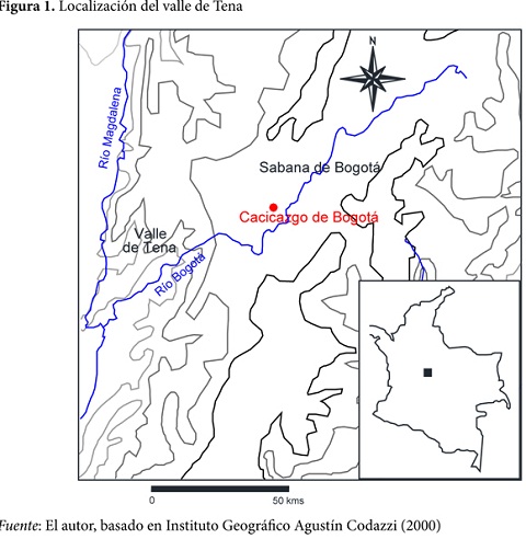 El valle de Tena es una región montañosa, cortada transversalmente por el río Bogotá. Una cadena montañosa con pendientes que pueden llegar a los 90° y que corre en sentido sur-norte separa la sabana de Bogotá del valle de Tena (ver la figura 1). No obstante lo agreste del terreno, la comunicación entre estas dos regiones es relativamente fácil, gracias a los cursos de quebradas que las cortan transversalmente. En apenas un par de horas es posible desplazarse a pie desde los bordes de la sabana de Bogotá hasta las zonas menos frías, donde inicia el valle de Tena. En las faldas de dichos cerros, conjuntos montañosos de menor inclinación, cortados en sentido norte-sur por quebradas que depositan sus aguas al río Bogotá, permiten no sólo la agricultura sino también los asentamientos humanos.
