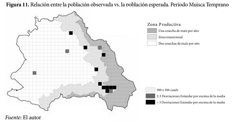 Durante el período Muisca Temprano, la mayor cantidad de la población continuó habitando las zonas I y II (32% y 36%, respectivamente), aunque un mayor porcentaje de población habitó la zona III (32%) (ver la figura 10). El centro de la comunidad supra-local de Cubsio siguió siendo definido por un conjunto de cuadrículas con población observada muy por encima de la población esperada; en tanto que otras cuadrículas con población observada por encima de la población esperada en la zona nororiental delimitan parcialmente la otra comunidad supra-local identificada para este período (ver la figura 11). Esto significa que las zonas productivas tampoco explican la distribución de los asentamientos para el período Muisca Temprano. De hecho, estas zonas productivas continúan siendo un muy pobre predictor del patrón de asentamiento regional (r²= 0,073, ˂ 0,0005).