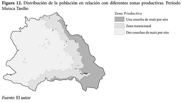 Fue durante el período Muisca Tardío que un mayor porcentaje de la población se asentó en la zona III (38%). Este mayor porcentaje se dio a expensas de la reducción del porcentaje de población de la zona I (24%), en tanto que el porcentaje de población que habitó la zona II permaneció prácticamente inalterado (38%) (ver la figura 12). Al igual que para los dos períodos anteriores, la población observada es superior a la población esperada en las zonas donde las comunidades supra-locales fueron definidas, lo que significa que la distribución de la población durante el período Muisca Tardío tampoco puede ser explicada como una función de las zonas productivas (r²= 0,056, p˂0,0005) (ver la figura 13).
