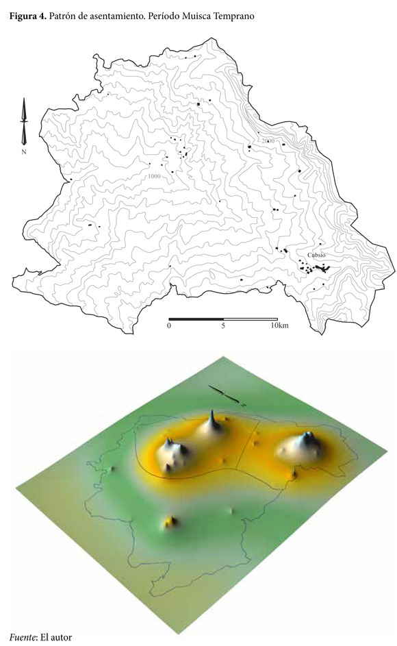El poblamiento documentado para el valle de Tena se remonta al año 300 A.C. Es posible, no obstante, que sitios de mayor antigüedad no hayan sido detectados, ya que la metodología de reconocimiento sistemático no está diseñada para encontrarlos. La cercanía del valle de Tena con sitios Precerámicos y Arcaicos, tales como Tequendama, Galindo y Aguazuque (Correal y Van der Hammen 1977; Pinto 2003), sugiere que estos primeros pobladores pudieron también habitar esta zona. Es más, se ha sugerido que el valle del río Bogotá constituía un corredor a través del cual los primeros pobladores se movilizaban entre el valle del Magdalena y la sabana de Bogotá. Muy poca gente vivió en dicha región durante el primer período de ocupación, denominado período Herrera. Los cálculos más liberales indican que allí no vivieron más de 260 personas, en un lapso de tiempo que va hasta el año 400 D.C. Durante este período, casi toda la población se concentró en las faldas de la cadena montañosa que separa el valle de Tena de la sabana de Bogotá, alrededor de un sitio de gran tamaño en la zona de Cubsio. Esta comunidad supra-local (sensu Peterson y Drennan 2005 y 2012)2 se asentó en la zona más fría del valle de Tena, a una altura de 2000 msnm. La zona cálida del valle de Tena fue escasamente poblada, y apenas un par de sitios fueron encontrados a una altura menor de 1200 msnm (ver la figura 3).
