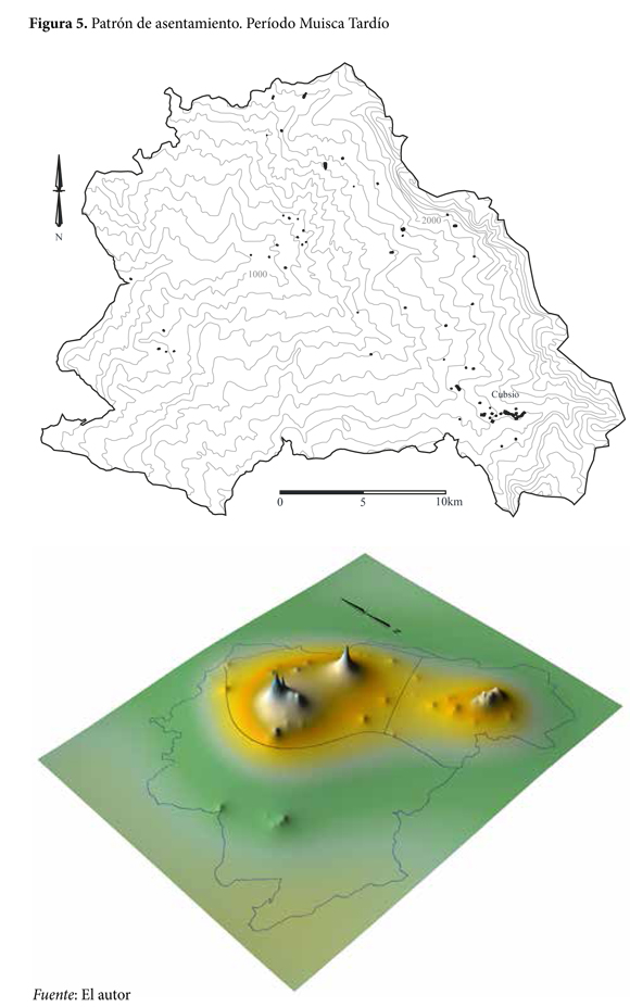 Tal vez el período en que los patrones de asentamiento del valle de Tena contrastan más con los del altiplano Cundiboyacense es el Muisca Tardío (1000-1500 D.C.). Mientras que en general se presentó un aumento, a veces dramático, de la población en el altiplano Cundiboyacense (Langebaek 1995 y 2001; Boada 2006 y 2013), en el valle de Tena la cantidad de población se mantuvo casi igual que en el período anterior, o incluso pudo haber disminuido a 456 personas. Tampoco hubo un cambio importante en los patrones de asentamiento en el valle de Tena. El mayor porcentaje de la población continuó viviendo en las faldas de la cadena montañosa que separa esta región de la sabana de Bogotá, agrupada en dos comunidades supra-locales. El poblamiento de la zona cálida del valle de Tena aumentó levemente, y para el momento de la invasión española, el 30% de la población vivía en ella (ver la figura 5).