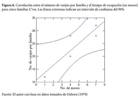 Si, por el contrario, los desplazamientos al valle de Tena fueran temporales (es decir, por unos meses) -verticalidad-, el registro arqueológico de esta región debería ser cuantitativamente diferente de aquel en el que se supone que la ocupación fue permanente. Como se puede demostrar con base en la información etnoarqueológica aportada por Osborn (1979), existe una fuerte correlación entre el lapso de tiempo que una familia habita en una casa y la cantidad de vasijas que utiliza (r=0,89, p=0,03, Y=2,85X +10,85) (ver la figura 6). Así las cosas, se espera que si la gente habitó en el valle de Tena sólo unos meses, la cantidad de cerámica que sea colectada en una vivienda de esta región debería ser menor que aquella colectada en una vivienda localizada en una zona donde la habitación fue permanente.