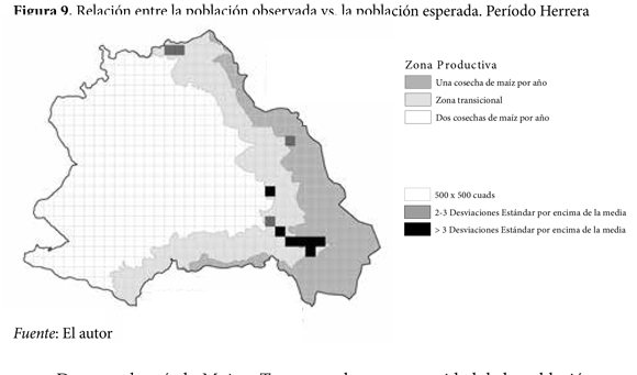 La figura 8 muestra la distribución de la población en relación con las diferentes zonas productivas, en tanto que la figura 9 muestra la relación entre la población observada vs. la población esperada para el período Herrera. Durante este período, la casi totalidad de la población vivió, o bien en la zona I (donde sólo es posible una cosecha de maíz al año, 40%) o bien en la zona II (transición, 51%), y apenas una pequeña parte de la población (8,5%) vivió en la zona III (donde son posibles dos cosechas de maíz al año). Cuadrículas con población observada muy por encima de la población esperada indican que la preferencia por alguna zona productiva en particular no fue el mayor condicionante del patrón de asentamiento durante el período Herrera. Dichas cuadrículas se agrupan en la zona de Cubsio, y configuran el centro de la comunidad supra-local antes identificada, lo que significa que definitivamente el patrón de asentamiento para este período no puede ser explicado como un intento de maximizar el acceso a los recursos agrícolas. En efecto, las zonas productivas escasamente pueden explicar un 1% de la distribución de la población durante el período Herrera (r² = 0,010, p ˂0,0005).