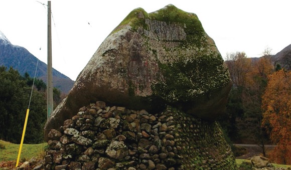 Esta piedra1 tiene una historia, no es una piedra así nomás. Es una 'piedra santa' donde había mucho newen Cuando pasó el camino por ahí, las máquinas empezaron a romper, romper, romper, y se dieron vuelta camiones, murió gente y no la pudieron sacar, esa piedra es muy grande, dos máquinas no pudieron sacarla y quedo ahí linda quedó al lado del camino nomás, no pudieron moverla, porque esa piedra era un lugar donde había mucho newen, donde la gente que tenía mucho conocimiento de espiritualidad iba a esa piedra para saber cómo íbamos a estar en cincuenta años más, en sesenta años, en la actualidad de hoy Y como la piedra quedó ahí, hicieron la cuestión de Pinochet, la inscripción que dice:
