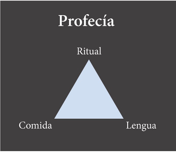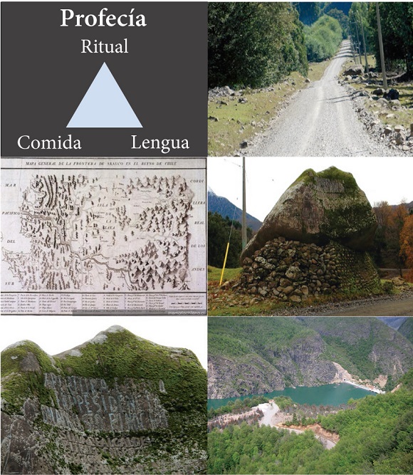 Incluso, la profecía pertenece a la misma red de relaciones y fuerzas a la que pertenece la 'piedra santa', red que posibilita un materialismo relacional en el que la piedra es capaz de anticipar futuros y resistir, al mismo tiempo, la apertura de caminos. La profecía, como expresión de un lugar constituido por entidades con distintas intensidades de fuerza o newen, evidencia la fuerza relacional de un mundo que resiste a la dictadura topológica, cronológica y lineal plegada en la piedra después de la construcción de caminos. Así, la profecía entendida como materialización de la capacidad de anticipar futuros -capacidad propia de los espacios renü-, permite dilucidar el tipo de relacionamiento fundamental necesario para la mantención de la vida más allá de la dictadura de los caminos del progreso y su temporalidad lineal. En la profecía, este relacionamiento se articula a través de tres elementos fundamentales: