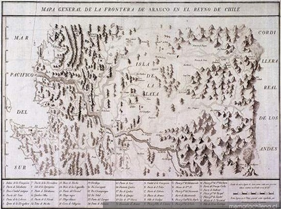 7 El mapa incluido en este artículo a continuación fue elaborado por Juan Ignacio Molina. "Mapa General de la Frontera de Arauco en el reyno de Chile, 1795". Disponible en Memoria Chilena, Biblioteca Nacional de Chile http://www.memoriachilena.cl/602/w3-article-73846.html Accedido en 8/8/2016.