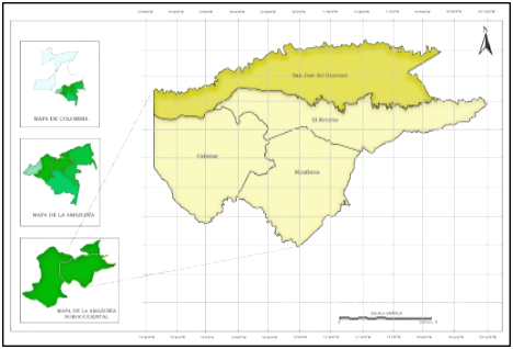 Figura 1 San José del Guaviare en el contexto departamental, subregional, regional y nacional