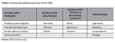 Uno de los más importantes instruccionistas del período 1905-1927, el doctor Antonio José Uribe, inspirado en las ideas del padre francés Didón, Fouillé y Demouiliens, y del emperador alemánGuillermo II (Uribe, 1927, 2, 5, 11, 13)4, concibió el problema de la educación como uno estrictamente nacional y racial. Su principal creación, la Ley 39 de 1904, fue la fiel síntesis de todo el pensamiento de la época, que además había sido concebido por Carlos E. Restrepo en 1903, cuando dirigía la Universidad de Antioquia. La Ley 39 se acoplaba a la Nueva Colombia, pacificada, católica, regenerada y capitalista. Esta Ley insistía en que la formación de los ciudadanos debía pasar por un proceso práctico y técnico, por el trabajo de laboratorio y el taller. El hábito de la observación, la inspección de los fenómenos naturales complejos, la relación de hechos reales o exactos, podrían evitar vagos conocimientos y adecuar la mente del estudiante en principios ordenadores de la vida de forma perdurable. Este cuadro esquemático de la Ley de 1903 refleja el alto contenido técnico-vocacional que tenía esta estructura (ibíd.):