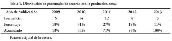 La tabla 1 nos indica que de los 45 documentos encontrados, se evidencia que la mayor producción fue en el año 2010 con 14 documentos, seguido del año 2011 con 12. Luego encontramos que en el año 2012 se hicieron 8 investigaciones, en el año 2009 se elaboraron 6 y, finalmente, en el 2013 encontramos 5 investigaciones sobre el tema de estudio del presente trabajo. En promedio la producción anual corresponde a 9 documentos, lo cual evidencia el interés por el tema de investigación; también llama la atención la producción generada en los años 2010 y 2011, lo cual se corresponde con la realización de actividades a nivel regional convocadas por la Comisión Económica para América Latina y el Caribe -CEPAL-, respecto del envejecimiento y la vejez.