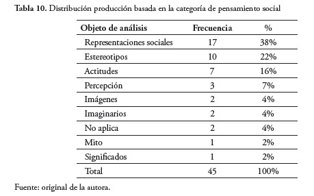 La tabla 10 presenta la producción del documento teniendo en cuenta las diferentes categorías del pensamiento social; sin embargo, es significativa en relación con el empleo de la categoría de representaciones sociales. En este caso, se halla un total de 17 documentos que representan el 38% de las publicaciones científicas, entre los años 2009 y 2013, que metodológicamente implementan el modelo propuesto por Moscovici, la Teoría de las Representaciones Sociales. De otra parte, algunos autores han optado por una categoría de pensamiento social diferente; de manera decreciente se encuentran 10 documentos que utilizan la categoría de los estereotipos, seguido de siete documentos que emplean la categoría actitud, tres documentos sustentan el estudio basados en la percepción, en dos documentos se empleó la categoría de imaginarios e igualmente imágenes; las categorías de mito y significados fueron utilizadas en un documento cada una; finalmente, dos documentos son aportes a nivel general e incluyen referencias a varias de las categorías objeto de investigación en esta compilación.