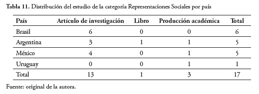 Como se aprecia en la tabla 11, el mayor número de publicaciones relacionadas con la categoría de representaciones sociales se efectuó en Brasil, con seis artículos. Lo sigue México y Argentina con cinco artículos cada uno, mientras que en Uruguay se ha publicado una sola tesis de maestría, en el periodo correspondiente al 2009-2013.