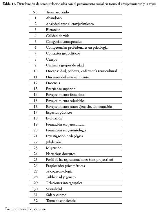 Ahora bien, dentro del objeto de estudio de la presente investigación se deben resaltar las investigaciones que en sus contenidos temáticos señalan las categorías de pensamiento social, en relación con el envejecimiento y la vejez. Siendo así, se elaboró la tabla 10 para particularizar las categorías encontradas.