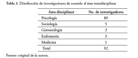 Si bien la búsqueda de la información se restringió al área psicológica, es pertinente mencionar que algunos trabajos investigativos son producto de la investigación interdisciplinaria. De la población investigada (92) encontramos que el mayor porcentaje de profesionales que investigaron sobre el tema de estudio de la presente monografía, corresponde a la ciencia psicológica. Siendo así podemos señalar en la tabla 3, que 80 autores de las investigaciones son profesionales de la psicología, cinco corresponden al área de la sociología, tres corresponden al saber disciplinar de la gerontología, al igual que tres publicaciones son del área de la enfermería, y solamente uno corresponde a la medicina.