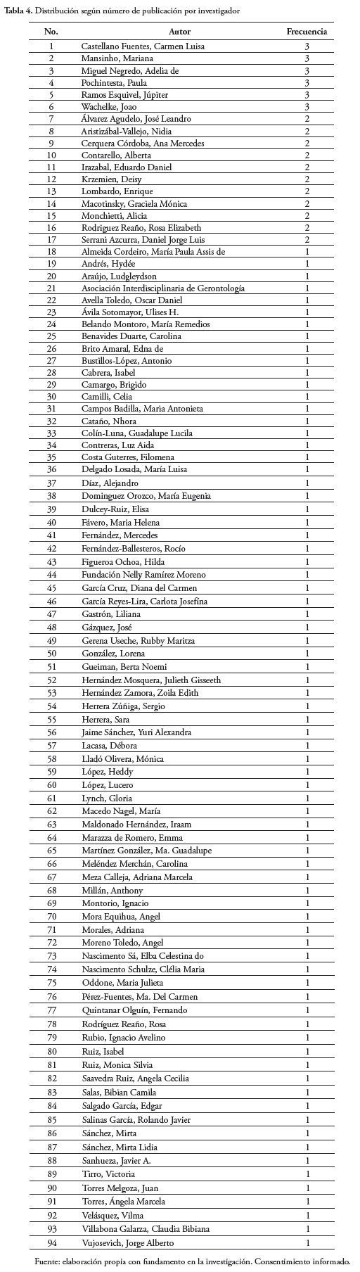 Al revisar el nombre de los investigadores, se puede señalar la frecuencia de documentos científicos producido por cada uno de ellos; la tabla 4 detalla que investigadores como Ramos Esquivel, Júpiter (México), Wachelke, Joao (Brasil), Pochintesta, Paula y Mansinho, Mariana (Argentina), Castellano Fuentes, Carmen Luisa y De Miguel Negredo, Adelia (España), son los autores que más número de publicaciones tienen, llegando cada uno de ellos a un máximo de 3 (6%) investigaciones realizadas en el área de estudio de la presente opción de grado. Entre tanto, once investigadores lograron materializar 2 (12%) publicaciones sobre el tema, en documento de información académica y/o publicación científica, ellos son Álvarez Agudelo, José Leandro; Aristizábal-Vallejo, Nidia; Cerquera Córdoba, Ana Mercedes; Contarello, Alberta; Irazabal, Eduardo Daniel; Krzemien, Deisy; Lombardo, Enrique; Macotinsky, Graciela Mónica; Monchietti, Alicia; Rodríguez Reaño, Rosa Elizabeth y Serrani Azcurra, Daniel Jorge Luis. Finalmente, el 82% de la producción en torno al tema de representaciones sobre el envejecimiento y la vejez, corresponde a una sola publicación durante este periodo, es decir 77 investigadores. El análisis anterior se puede referenciar en la tabla 4.