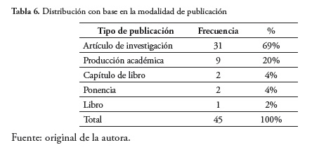 Se pone de manifiesto que las investigaciones halladas se extraen de fuentes de información primaria. De acuerdo con la literatura relacionada a la investigación científica y puesta de manifiesto por Hernández Sampieri et al. (2006), se considera que una fuente de investigación primaria es aquella en la cual "se trata de documentos que contienen resultados de los estudios correspondientes (...) como artículos de publicaciones periódicas, libros, tesis, disertaciones" (p. 66). El análisis en frecuencia y porcentaje relacionado con la modalidad de publicación se puede observar en la tabla 6.