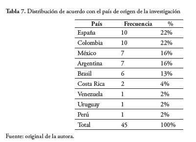 De acuerdo con el país de origen de las diferentes publicaciones y de los investigadores, la tabla 7 detalla la producción respecto de las diferentes formas de pensamiento social, principalmente en América Latina y España. Por tanto, se aprecia que del total de la producción científica, Colombia y España registran un 22%, cada uno, lo cual equivale a 10 documentos respectivamente; le siguen México y Argentina con un 16%, que corresponde a siete documentos por cada país. Posteriormente, figura Brasil con un total de seis documentos que equivalen al 13%. De otra parte, en Costa Rica se publicaron dos documentos y, finalmente, están Perú, Uruguay y Venezuela con un artículo cada uno, lo cual equivale al 2%.