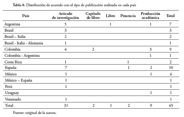 Es importante señalar que algunos documentos fueron producidos por investigadores de dos o tres países diferentes, por ejemplo, en cuatro casos los investigadores son de dos países: Brasil - Italia (2), Colombia - Argentina (1) y México - España (1), y sólo en un documento participan investigadores de tres países: Brasil - Italia - Alemania. Para mayor detalle, la tabla 8 muestra el tipo de producción de acuerdo con el país de origen del o los investigadores.