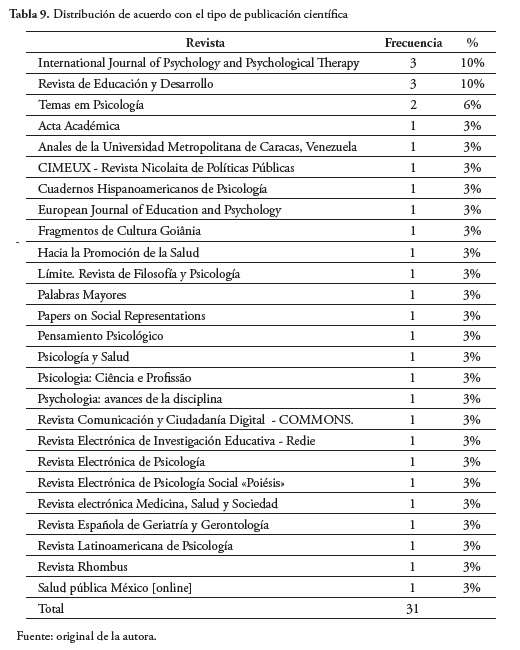 En la revisión correspondiente a las revistas científicas que aceptaron publicar los artículos de investigación, se encuentra una variedad de 26 revistas, de las cuales 13 son especializadas en psicología, las demás se relacionan con ámbitos de la salud, la educación, la cultura, la geriatría y las políticas públicas. En la tabla 9 se observa que dos revistas publicaron en total tres artículos cada una, lo cual equivale al 20% de las publicaciones a través de este medio; estas revistas son: International Journal of Psychology and Psychological Therapy, editada en España, y la Revista de Educación y Desarrollo publicada en México. Le siguen con un seis por ciento dos publicaciones en la revista brasileña Temas em Psicologia. Las restantes 28 revistas publicaron un artículo (3%) relacionado con el tema de investigación del presente estudio. Del total de los artículos de investigación, cinco fueron publicados en el idioma inglés en las revistas Temas em Psicologia (2), European Journal of Education and Psychology (1), Papers on Social Representations (1) y en la Revista Latinoamericana de Psicología (1); dos artículos más fueron publicado en portugués en la revista Fragmentos de Cultura Goiânia (1) y en la revista Psicologia: Ciência e Profissão (1).