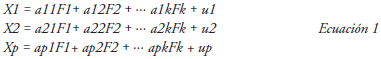 F1,...,Fk (k<<p) son los factores comunes y u1,...up los factores únicos o específicos y los coeficientes {aij; i=1,...,p; j=1,...,k} las cargas factoriales.