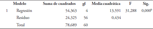 Con una R cuadrada de .691, se puede decir que el 69 % del fraude se debe a la interacción directamente proporcional de tres de las cuatro variables del bloque que integran el modelo de regresión. En este escenario, la variable de control interno es la única que muestra signo negativo, lo que lleva a comprender que la falta de control interno invita a incrementar el fraude en las empresas. Con un valor de F de 31.28 y significancia de .000, se puede decir que el modelo es adecuado para predecir el comportamiento de las variables independientes sobre la dependiente.