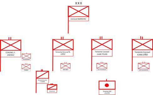 En cuanto al Ejército Realista, este se encontraba bajo el mando del Coronel José María Barreiro Manjón, cuyo Jefe de Estado Mayor era el Teniente Coronel Sebastián Díaz. Las tropas del Ejército Realista estaban organizadas en cuatro secciones, un regimiento de dragones y una compañía de artillería (Tabla 3 y Figura 6).