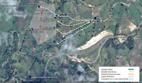 La forma en que los rangos organizativos operó sobre esos cuerpos combatientes se puede ver reflejada a lo largo de toda la batalla. Quince minutos después (14:45 horas), el Batallón Cazadores de los españoles hizo movimiento retrógrado hacia el puente con la intención de pasarlo y apoyar el resto de batallones españoles (5° 27' 15” N - 73° 25' 35” W), mientras eran atacados por el Batallón Cazadores de los patriotas (5° 27' 15” N). A las 15:00 horas continuaban los combates entre el Batallón Cazadores de los españoles, quienes continuaban haciendo movimiento retrógrado por el camino real (5° 27' 06” N - 73° 25' 47” W), y los batallones Cazadores (5° 27' 09” N - 73° 25' 44” W) y Primero de Línea de los patriotas (5° 27' 10” N - 73° 25' 41” W). La retaguardia del Ejército Libertador, por órdenes de Simón Bolívar, envió al Escuadrón Guías de Retaguardia como apoyo para sus hombres en la vanguardia (5° 27' 12” N - 73° 25' 37” W). Esta serie de aspectos, siempre relacionados con esta estructura organizativa jerárquica, dan cuenta de la forma en que una división del trabajo o las labores especializadas distribuye a los miembros de las tropas de forma diferencial sobre el espacio geográfico (Figura 8).