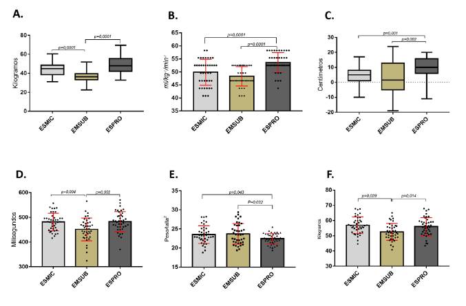 En la determinación de la composición corporal por bioimpedancia, se hallaron diferencias significativas en el IMC entre ESMIC vs. ESPRO (p = 0,045) y entre EMSUB vs. ESPRO (p = 0,030). Respecto al valor absoluto de masa grasa, aparecieron diferencias entre ESMIC vs. ESPRO (p = 0,03) y entre EMSUB vs. ESPRO (p = 0,004). Finalmente, en el valor absoluto de masa libre de grasa, las diferencias se encontraron entre ESMIC vs. EMSUB (p = 0,014) y entre EMSUB vs. ESPRO (p = 0,029) (Figura 2).