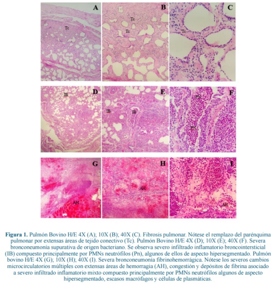 O complexo respiratório bovino consiste em uma infeção respiratória provocada pela combinação de diferentes agentes infeciosos, compromisso das defesas do anfitrião e fatores predisponentes com morbilidade, mortalidade e perdas econômicas significativas. Se realizou um estudo transversal, duplo-cego de caráter descritivo com o objetivo de caracterizar microscopicamente os patrões pneumônicos do complexo respiratório bovino e relacionalos com aspectos clínicos da doença. Tomaram-se amostras de 112 pulmões bovinos interditados no abatedouro do município de Pasto, Nariño, Colômbia, as quais se processaram mediante a técnica de inclusão em parafina e tinção de hematoxilina e eosina rotineiras. Se realizou uma descrição histopatológica dos patrões pneumônicos segundo o patrão de distribuição e o grau de severidade e classificaram-se as lesões de acordo ao tipo de alteração. A pneumonia intersticial foi o achado mais comum (41,1%), seguido da pneumonia broncointersticial (11,6%). O 48,2% dos bovinos não estavam clinicamente saudáveis prévio ao momento de sacrifício. O padrão de distribuição e o infiltrado inflamatório foram predominantemente mononucleares no espaço intersticial com um 41,1%. As alterações crônicas foram predominantes (60,7%). Os resultados indicam que os bovinos objeto de estudo são animais com doenças de curso longo, com impacto negativo em seu potencial produtivo, o qual pode ser explicado por fatores tais como deficiências no manejo do plano sanitário, falhas no diagnóstico e abordagem clinico, tudo isto, aumentando o descarte involuntário. Clinicamente recomenda-se o diagnóstico de afecções respiratórias mediante métodos diretos e indiretos (sorologia, PCR).