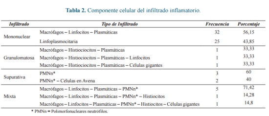 El patrón de distribución y el infiltrado inflamatorio fue variable (Tabla 1), predominantemente mononuclear en espacio intersticial (41,1%), seguido de un infiltrado mononuclear en vía aérea y espacio intersticial (9,8%). Adicionalmente se encontraron infiltrados supurativos, mixtos y granulomatosos localizados en pleura, vía aérea y parénquima funcional. En la tabla 2 se relaciona el componente celular del infiltrado inflamatorio.