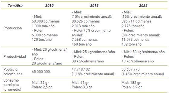 En el 2010, la CPAA, estableció las proyecciones de consumo interno percápita promedio, producción y productividad por colmena para el periodo comprendido entre el 2011 y el 2025 para miel y para polen.