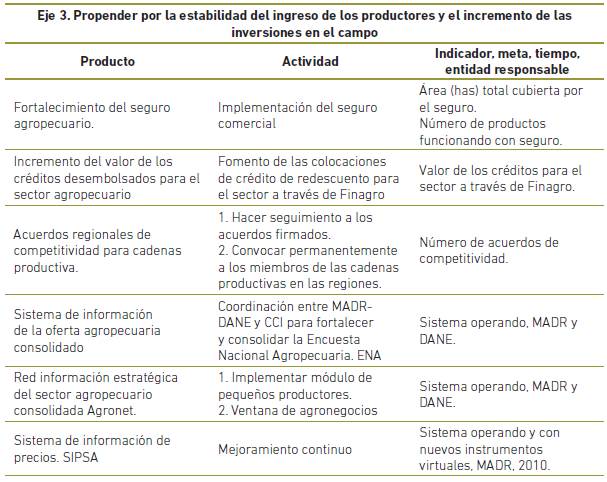 El plan "competitividad en el sector agropecuario", diseñado por el Ministerio de Agricultura y Desarrollo Rural basandose en los objetivos generales de la PNCP, matizandolos para el sector, propone cuatro ejes estrategicos y una serie de objetivos por eje que se desarrollan en matrices de actividades y productos que en la mayoría de los casos incluye indicadores de seguimiento, metas, plazos y responsables.
