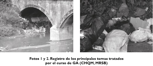 El gráfico 1 muestra que los principales temas tratados por los estudiantes fueron manejo de residuos sólidos en los barrios -MRSB- y contaminación hídrica de quebradas municipales -CHQM- (fotos 1 y 2), debido a que son las problemáticas ambientales más comunes en sus entornos. De igual manera, los temas que generaron mayor discusión y polémica fueron el manejo de residuos sólidos en los barrios - MRSB, contaminación hídrica de quebradas municipales -CHQM- y contaminación ambiental generada por empresas -CAGE-, a pesar de que este último no fue uno de los temas de mayor frecuencia.