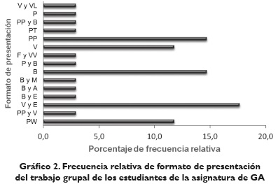 Los estudiantes adoptaron 15 diferentes formatos de presentación del trabajo grupal, entre ellos: página web -PW-; presentación prezi y vídeos -PP y V-; vídeo y encuestas; -V y E-; bitácora y encuestas -B y E-; bitácora y artículo -B y A-; bitácora y maqueta -B y M-; bitácora -B-; prototipo y bitácora -P y B-; folleto y visitas a viviendas -F y VV-; vídeo -V-; presentación power point -PP-; presentación tradicional -PT-; presentación prezi y blog -PP y B-; prototipo -P-, y vídeo y visita a laboratorio -V y VL-.