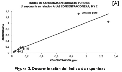 Para determinar el índice de saponinas en los extractos de S. saponaria se utilizó el método de hidrólisis de azúcares de Miller por espectrofotometría a una longitud de onda 570 nm. Se elaboró una curva de calibración para relacionar la cantidad de azúcares generados por la hidrólisis de las saponinas, utilizando como estándar una solución de glucosa.
