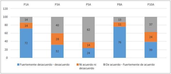 Se evidencia como la pregunta que obtuvo un resultado más marcado hacía el antropocentrismo fue la pregunta 5, identificada como P5A en la figura 1. Para esta pregunta, el 62 % de los residentes, están de acuerdo en algún grado, en que los recursos son abundantes y solo se tiene que aprender a desarrollarlos; lo anterior es contrario a la situación real y evidencia el desconocimiento de los límites planetarios. Las otras cuatro preguntas, la 1, 3, 6 y 10; identificadas en la figura 1 como P1A, P3A, P6A y P10A respectivamente, no tienen una tendencia tan marcada al antropocentrismo y en todos los casos el porcentaje de respuesta de acuerdo en algún grado se ubicó por debajo del 50 % de la muestra encuestada. Las Preguntas PA3 y PA10 también obtuvieron un porcentaje importante de respuestas con una actitud a favor del antropocentrismo, estas preguntas fueron sobre la inventiva humana como alternativa a no volver la tierra inhabitable con un 40 % de acuerdo en algún grado y el conocimiento de los seres humanos para poder controlar la naturaleza con un 37 % de acuerdo en algún grado; es decir esto muestra cómo además de pensar que los recursos son ilimitados, los residentes también creen que la inventiva humana será capaz de desarrollar conocimiento para poder seguir habitando la tierra. Por último, se observó también en dos preguntas, resultados fuertemente en desacuerdo o en desacuerdo con las dos preguntas asociadas a actividades antropocéntricas sobre, el derecho del ser humano a modificar el medio ambiente con un 72 % en desacuerdo en algún grado y la pregunta que llama exagerada a la crisis ecológica con un 76 % en desacuerdo en algún grado, es decir la mayoría de las personas si consideran que existe una crisis ecológica, estos resultados se pueden observar a continuación en la figura 1.