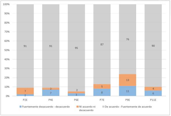 En lo referente a las actitudes eco-céntricas se puede observar en los resultados obtenidos, que se evidencia una notable tendencia hacía el eco-centrismo, en cuatro de las 6 preguntas sobre eco-centrismo identificadas como P2E, P4E, P6E, P7E, P9E y P11E en la figura 2, se obtuvieron porcentajes de acuerdo en algún grado sobre el 90 % y para las otras dos la respuesta igualmente con una actitud positiva fue de 87 % y 76 %, estos resultados se pueden observar en la figura 2 presentada a continuación: