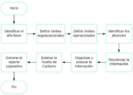 El estudio se llevó a cabo bajo la siguiente directriz, norma ISO 14064-1/2006, ya que se utiliza para medir la HC corporativa en las organizaciones. Adicionalmente, la norma ISO 14064 es una herramienta que tiene como objetivo dar credibilidad a los informes, y busca a través de su implementación reducir los GEI empleando diferentes criterios proporcionados. Es necesario establecer el año base para medir la HC corporativa, es decir, el periodo en cual se realizó la medición. En este caso, se eligió 2018 como año base. Se diseñó un diagrama de flujo (Figura 1), que indica los pasos a seguir para medir la HC, evitando así la falta de información o errores en el cálculo.