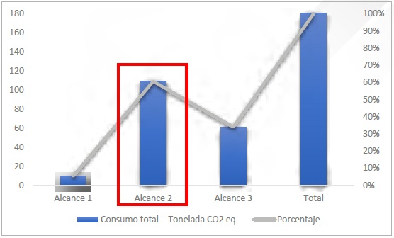 Finalmente, las emisiones totales generadas por la FUKL ascienden a un total de 180,24 toneladas de CO2eq. Como se puede observar en la figura 2, el alcance 2 es el que genera mayor impacto, con un 60,6 % en el total de las emisiones, seguido del alcance 3, con un 34,1 % generando un impacto medio, y finalmente, el alcance 1, generando el 5,76 %, lo que representa un impacto bajo en el total de emisiones.