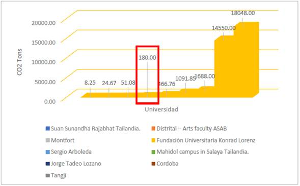 Finalmente, como se muestra en la figura 3 se realiza una comparativa con las universidades analizadas, mostrando las emisiones de CO2eq generadas al medioambiente, donde se puede observar que el grupo de IES analizadas han emitido un total 36131 toneladas de CO2eq, y la FUKL ha contribuido en un 0,50 % del total emitido para este caso de estudio.