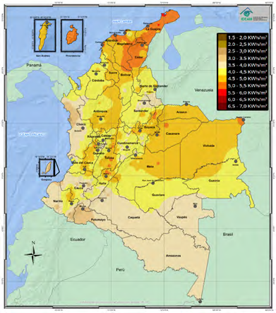 Figure 1 Multiannual average of the global irradiation received on a horizontal surface during the day in Colombia (KWh/m2 per day)