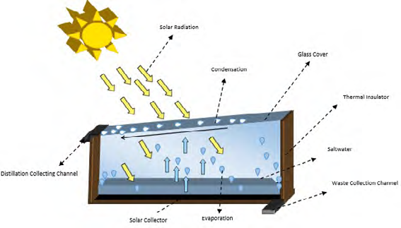 The performance of solar stills depends on the power of solar irradiation, the environmental temperature, and the shape and characteristics of the still. The principle of solar stills is to mimic the natural cycle of water, which begins with evaporation, using solar irradiation as an energy source. The simple effect of solar still comprises a box covered by an inclined glass. The box has a black bottom where the water to be evaporated is placed and occupies most of the box’s surface. A system of ducts for collecting distilled water. The water