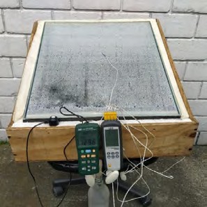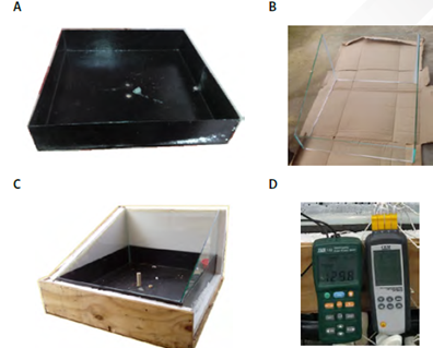 The dimensions of the simple effect solar still are 0.5×0.5m2 (base), and 0.1m of height, 3mm thickness. The base material is steel, and to maximize solar radiation absorption, their surfaces are covered with black paint, as shown in Figure 3-A. The glass cover has 4mm of thickness and an inclination angle of 23° with horizontal (Figure 3-B). Plywood and expanded polystyrene are used as insulation for the bottom and sides (Figure 3-C). A pyranometer (Figure 3-D left) measured the solar irradiation (W/m2), and a digital thermometer coupled with type J thermocouples (Figure 3-D right) measured the temperatures of the base, water, and glass cover.