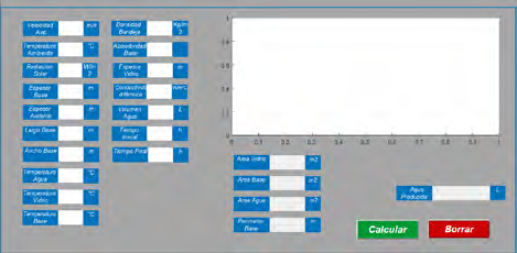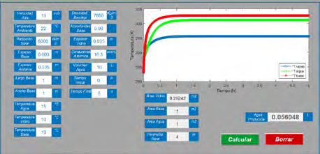 The software was structured to receive the input data that feeds the mathematical model as shows in figure 5. These data include solar irradiation (W/m2), ambient temperature (°C), wind speed (m/s), base thickness (m), insulation thickness (m), base length (m), base width (m), initial water temperature (°C), initial glass cover temperature (°C), initial base temperature (°C), density of the base (kg/m3), absorptivity of the base, thickness of the glass (m), base thermal conductivity (W/m°C), initial volume of water (L), initial time (h), final time (h). Once the user enters the data, the green button calculate (Calcular) must be pressed to all data run the simulation.