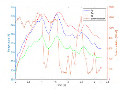Figure 7 Experimental temperatures of glass cover (Tg), water (Tw) and base (Tb), and solar irradiation measured during validation process at conditions in Bogotá, Colombia