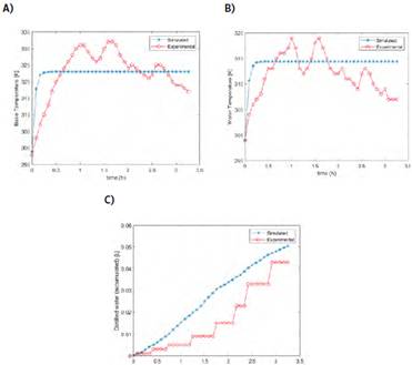 Subsequently, were compared the data from the experimental prototype and simulation through the comparison of the base and water temperature, and the distillated water volume (Table 1 and figure 8). The data from the experimental prototype and simulation (Figure 8), have a mean absolute percentage error (MAPE) of 1.47% for base temperature and 1.11% for water temperature (Figure 8 A and B).