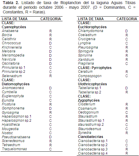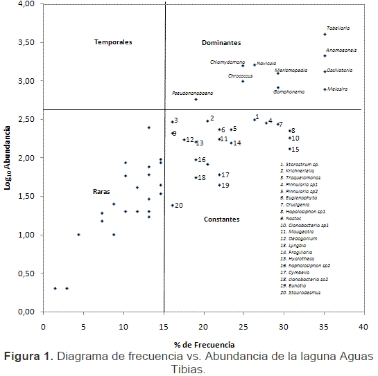 Riqueza específica del fitoplanctonSe determinaron 55 géneros pertenecientes a siete divisiones (Cyanophyta, Diatomophyta, Ulothricophyta, Euchlorophyta, Zygophyta, Rhodophyta y Pyrrophyta). La división que presentó mayor variedad de géneros fue Diatomophyta (16 géneros), siguiéndole en importancia Cyanophyta, Euchlorophyta y Zygophyta (13, 9 y 9 géneros, respectivamente). En la Tabla 2 se presenta la lista sistémica de los géneros de la laguna Aguas Tibias. El diagrama de frecuencia vs. Abundancia (Figura 1) mostró que los géneros Tabellaria, Anomoeoneis, Navicula, chlamydomona, Oscillatoria, Merismopedia, Chrococcus, Gomphonema, Melosira y Pseudoanabanena fueron dominantes; 20 géneros se determinaron como constantes, de los cuales Staurastrum sp.2, kirchneriella, Traquelomonas, Pinnularia sp.1 y Crucigenia presentaron densidades importantes. Veintiún géneros fueron raros.