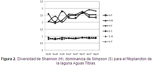 La diversidad de Shannon, calculada para las aguas superficiales en todos los meses, osciló entre 2,04 y 2,8 bits (19 a 28 géneros con mayor probabilidad de salir en los muestreos); y la dominancia de Simpson tuvo estimaciones entre 0,78 y 0,91 (78 a 91% de probabilidad de extraer dos individuos de la misma especie en un muestreo) (Figura 2). Todos estos índices revelan una comunidad fitoplanctónica muy diversa y de alta proporcionalidad, es decir con baja dominancia de especies. Parecería que la megadiversidad de la laguna se manifiesta también en las microalgas planctónicas, hipótesis que deberá evaluarse en el futuro. Para entender los resultados obtenidos en la laguna Aguas Tibias es muy importante considerar la confluencia de aguas provenientes del volcán Puracé que contribuyen a aumentar la diversidad del fitoplancton de la laguna. Por otra parte, los meses de octubre de 2006 y diciembre de 2006 presentaron las diversidades más altas (Figura 2), comportamiento que coincide con las abundancias fitoplanctónicas más elevadas (Figura 3), posiblemente porque en dichos muestreos se redujo la dominancia de algunas especies de los géneros Tabellaria, Anomoeoneis, Chlamydomona y los otros géneros considerados como constantes y aumentó la proporcionalidad de la comunidad. El índice de Simpson mostró una baja dominancia, coherente con la alta diversidad de Shannon.