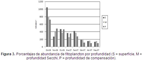El fósforo registró valores entre 0 y 0,3 umol L-1. Los meses de octubre y noviembre de 2006 y mayo de 2007 muestran valores superiores a 0,02 umol L-1 (en las tres profundidades). Los meses restantes están entre 0 y 0,02 umol L-1. Estos valores pueden corresponder a la fracción inorgánica particulada procedente en algunos casos de rocas volcánicas y de los sedimentos aluviales (Esteves, 1988; Gibbs, 1970).